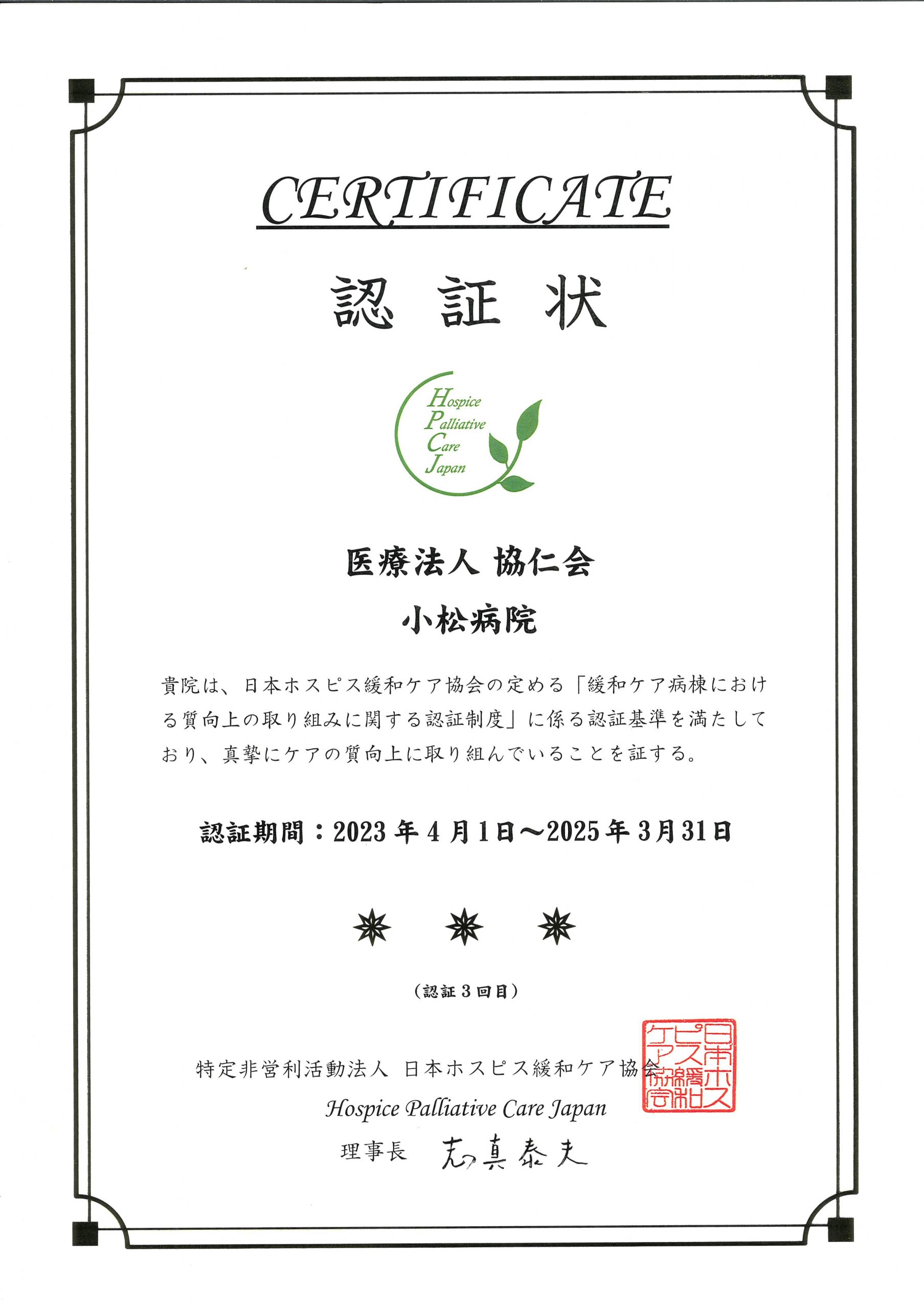 緩和ケア病棟の質をいかに保証するかが最近の課題になっています。日本ホスピス緩和ケア協会が定める「緩和ケア認証制度」が開始され当院緩和ケア病棟はH29年4月1日付で認証されました。